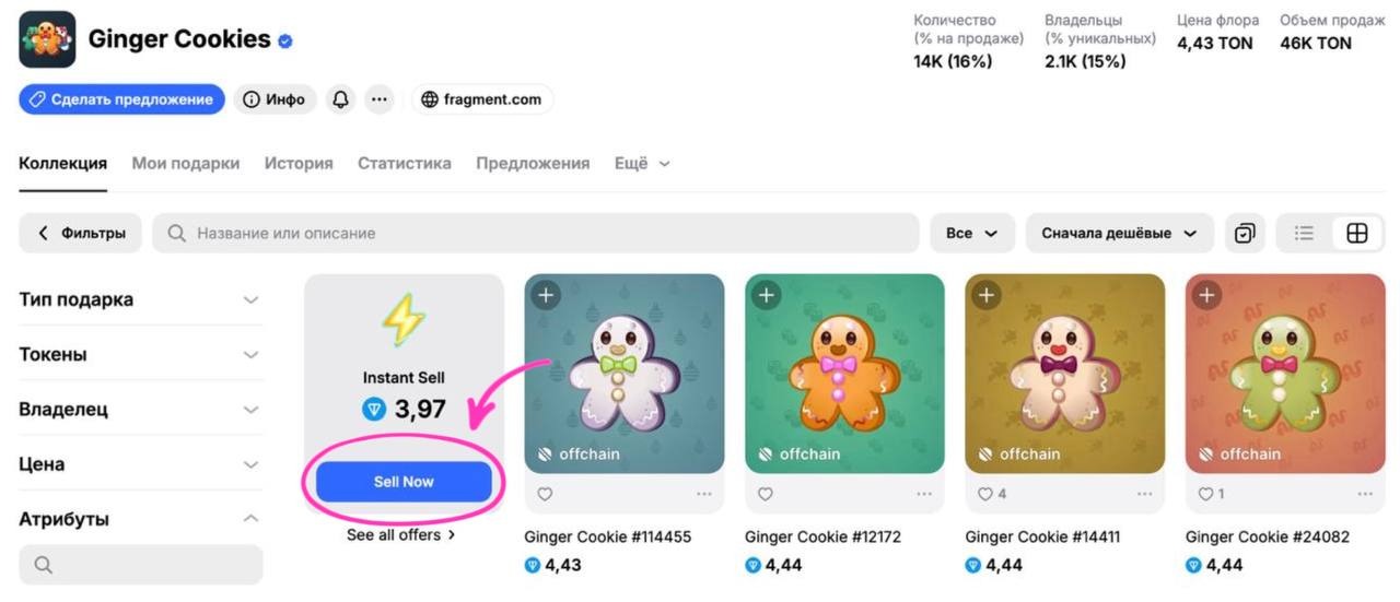 Instant Sell - это раздел офферов на коллекцию, в котором отображаются предложения без атрибутов с ценой в 85% от флора и выше. Раздел находится на стартовой странице коллекции.