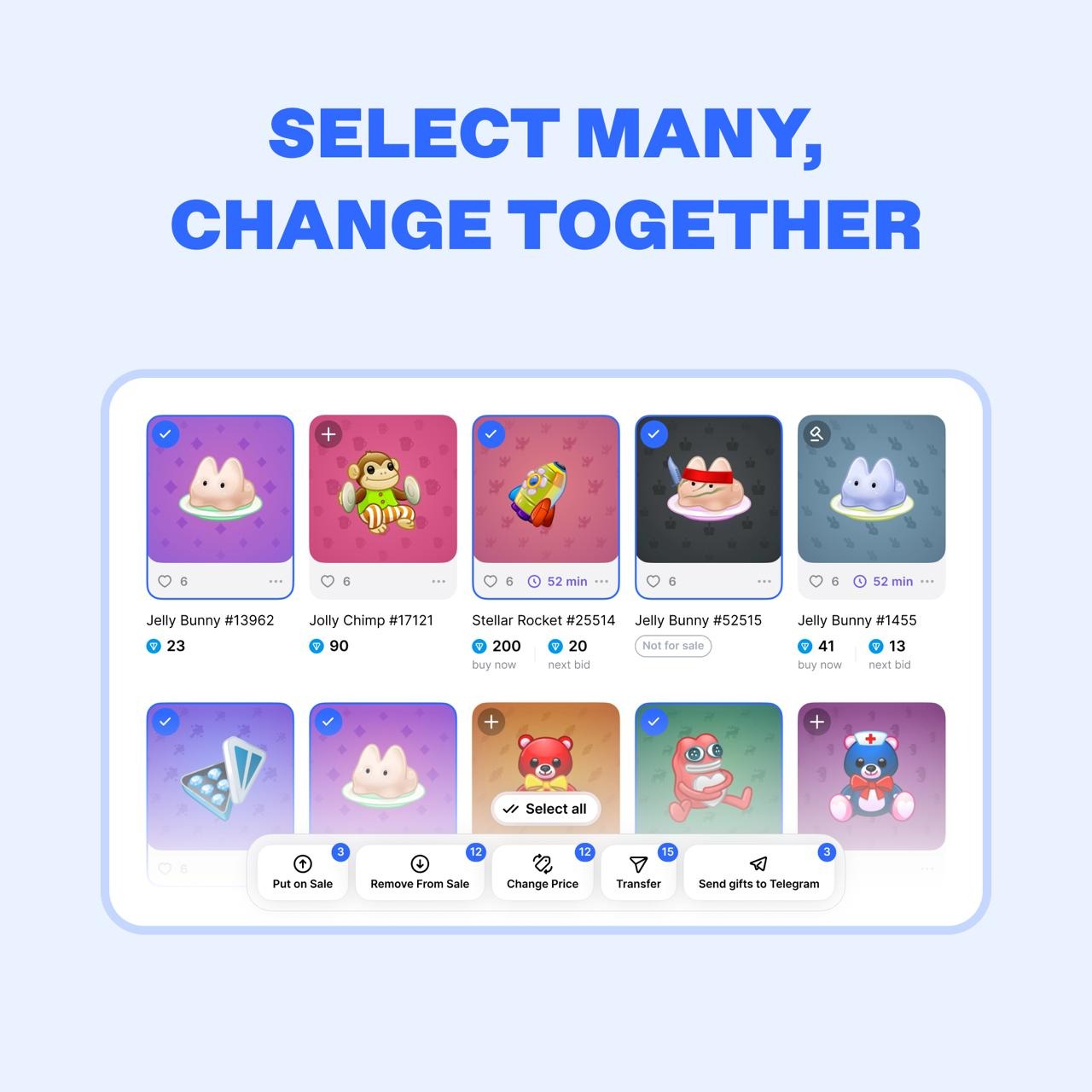 - Изменять цену сразу для группы NFT;