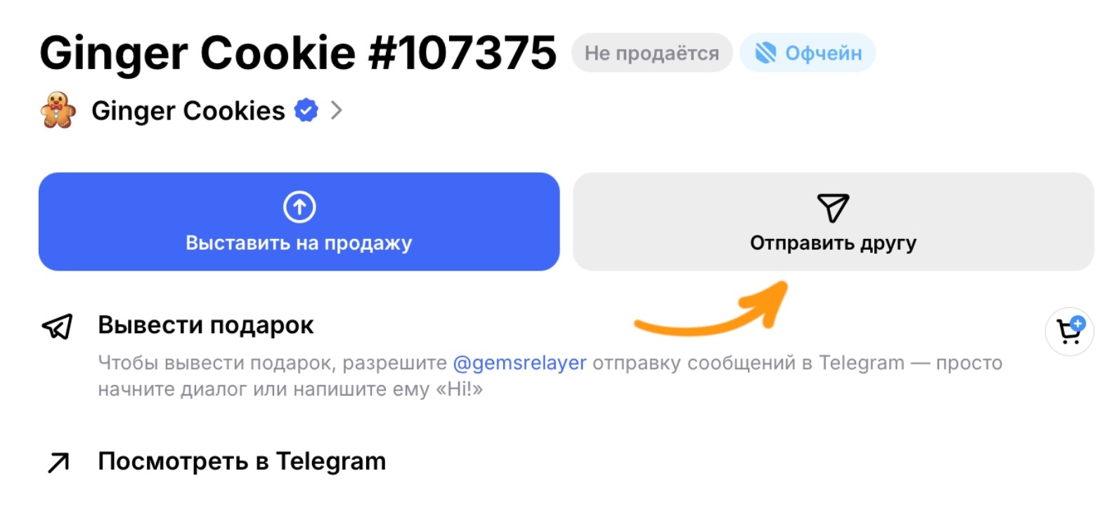 Вы можете передавать NFT и подарки с отметкой «Offchain» на другие кошельки*, не покидая Getgems. Для этого перейдите на страницу актива и нажмите кнопку «Отправить другу»: